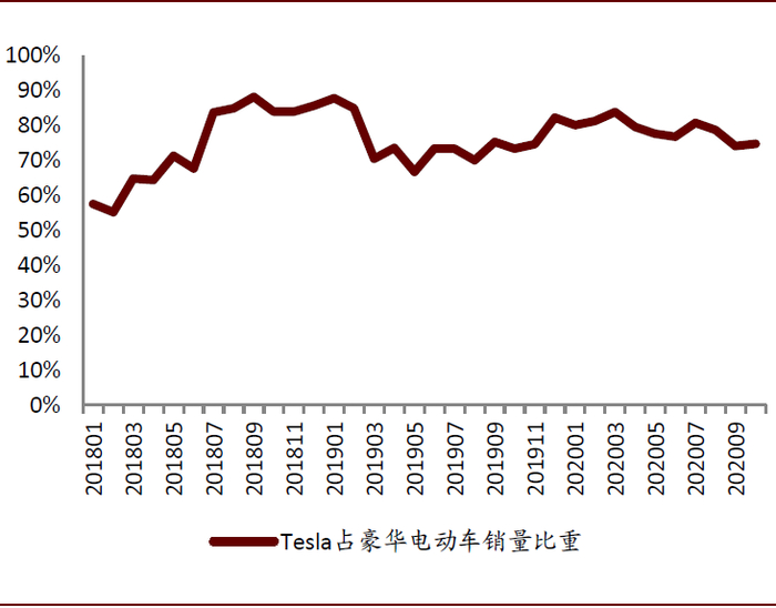 图表: 北美市场特斯拉在豪华品牌(EV)中的渗透率