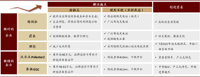 图表: 各新能源车企的如何解决痛点、创造需求