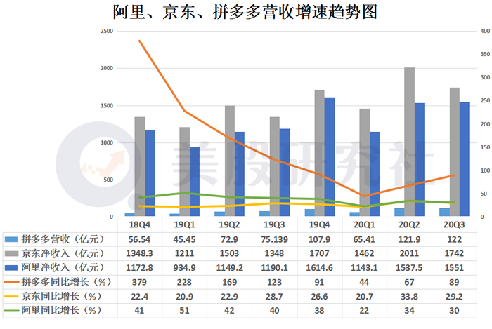 在电商板块中,电商三巨头已逐渐形成规模效应,在行业中长期占据着头部地位。最新季度中,阿里营收达1550.59亿元,同比增长30%;京东实现营收1742亿元,同比增长29.2%;拼多多营收为142.1亿元,同比增长89%。此外,拼多多还在Non-GAAP下首次实现季度盈利,达4.67亿美元。