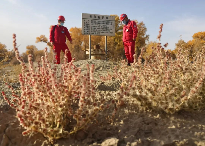 “我们每个月就要来这些封堵的油井巡检一遍,看看井口有无异常和复垦后植被生长的情况”,在距离塔里木油田吉拉克处理站原址约3公里处的吉拉101井场上,桑吉采油作业区员工向波和李金声穿过金色的胡杨林来到井场上巡查。地面上,一簇簇骆驼刺、罗布麻都已长出地表。