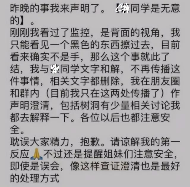但有一说一,当通过监控得知事情原委后,学姐发了朋友圈对自己的行为及造成的影响表示“非常抱歉和惭愧”。