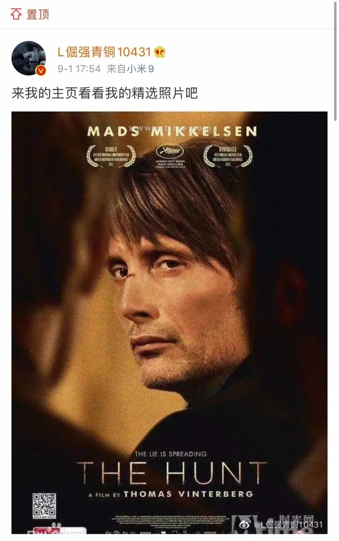 电影《狩猎》中,男主角卢卡斯被指控性侵女童后,成为了整个小镇排挤和压迫的对象。罗冠军将这部电影的海报设为其微博的置顶。
