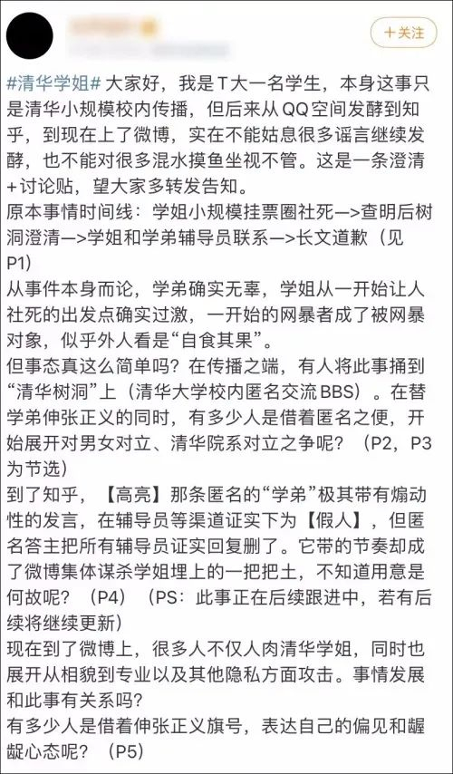同时,她也通过辅导员向男生道歉,还在清华校内论坛的树洞上发了长文。