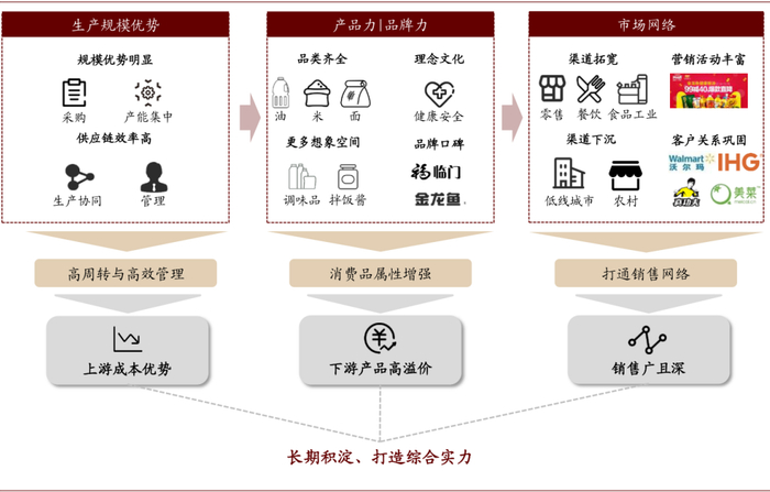 我们认为打造平台型企业应在三个方面看到竞争力,在生产环节需具备完善的供应链布局,以此为底层支持,推动压榨端效率提升;在产品端需具备品牌打造能力,借此不断提升产品的品牌溢价;在销售端需建立宽而深的渠道网络,以高效管理为渠道提供助力。