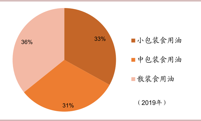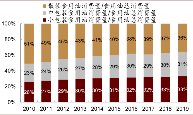 依托消费升级,食用油行业质的提升将是未来最大看点:食用油产品分为小包装(约5L)、中包装(10L~22L)、散装三种规格。其中小包装以家庭消费为主,中包装以餐饮消费为主,散装用于工业消费,部分用于家庭及餐饮消费。我们估算2019年三种规格油的消费量占食用油消费量比例约33%、31%、36%。从中长期看,我们认为食用油行业将显著受益于消费升级趋势,未来质的提升将从三个维度同时展开,即包装化、品牌化、高端化。