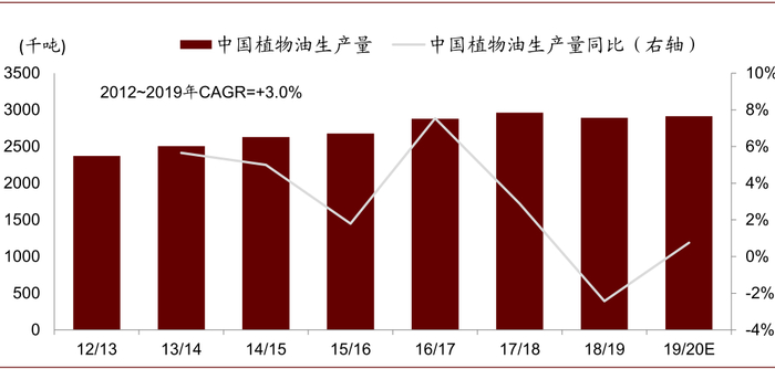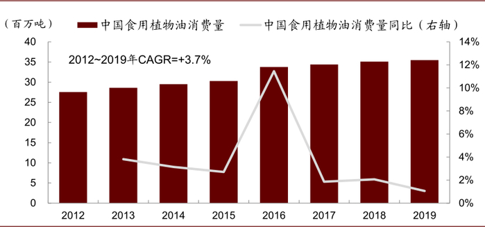 消费量低个位数增长,人均消费量趋稳:据国家粮油信息中心,2019年中国食用油消费量3,548万吨,2012~2019年CAGR+3.7%。同时,人均消费量基本稳定,据联合国粮农组织,2020年中国人均食用油消费量约28千克/年,明显超过世界平均。且随“低盐、低油”健康理念传播,我们判断人均消费量向上空间有限,未来将呈低个位数增长。