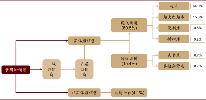 食用油渠道需要宽广覆盖、持续下沉:食用油消费多在线下实体店,据欧睿数据,2019年国内包装食用油线下渠道比例高达95.9%,其中超市、超大型超市、夫妻店、杂货店占据主导,这些门店分散在各级省市、县城及农村等多层市场,数量较大。因此,对食用油企业而言,如何覆盖更多终端门店,并持续下沉,是扩大销售规模的关键。