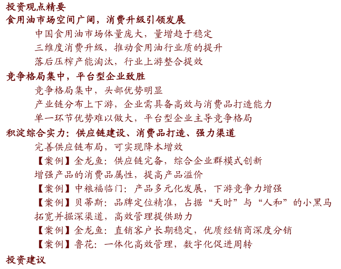 行业变革加快,企业凭单一优势难以做大:食用油产业链上游偏工业化逻辑,下游偏消费品逻辑,且上游为下游提供基础支持。同时,行业不断变革中,上游压榨走向集约化,下游持续体现消费升级,双重竞争压力更考验企业综合能力。在这一商业模式下,我们认为如企业仅凭借单一点位优势,将难以有效打通产业链并持续做大做强。
