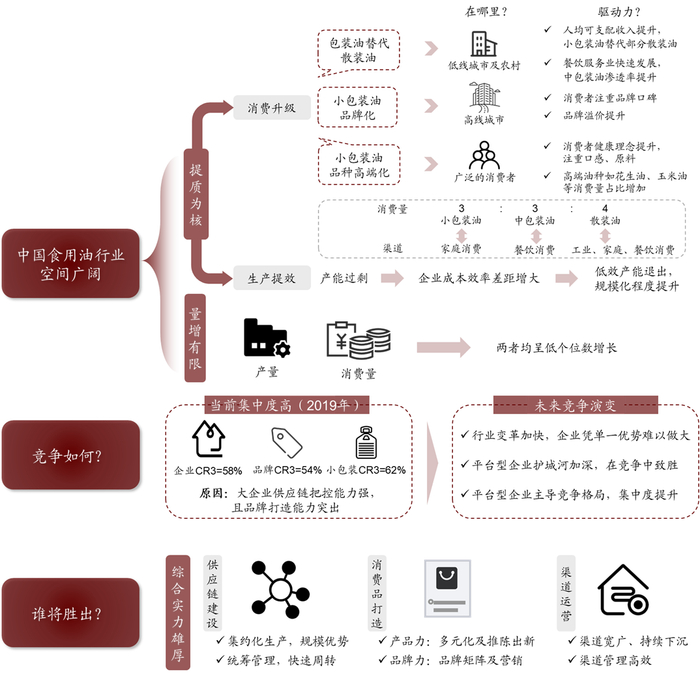 中国食用油行业市场规模约3,000亿元,规模大,机会广阔。依托消费升级,我们判断食用油行业未来趋势将是包装化、品牌化、高端化,并由此带来行业规模及盈利中枢的持续抬升。当前竞争格局高度集中,平台型企业在供应链建设、消费品打造、渠道搭建上具有优势,构筑起较高壁垒,有望引领行业发展并继续整合市场。