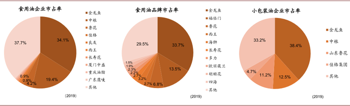 注:从左至右依次为食用油企业市占率、品牌市占率,及小包装油企业市占率