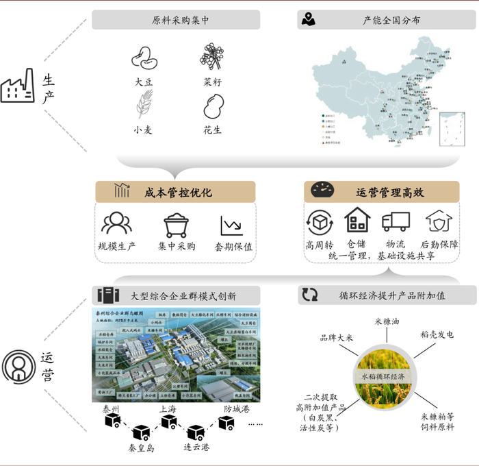 ► 上游压榨为主,具有成本加成属性:压榨业务是指将原材料大豆榨成散装豆油、豆粕的过程,初加工产品用于加工包装油、饲料。因大豆价格与豆油价格同趋势波动,压榨业务具有成本加成特征,吨毛利变动则取决于下游需求变动。考虑豆油需求以食用为主因而相对稳定,饲料需求变动成为压榨吨毛利变动主因,压榨利润与饲料产量呈正相关。因此,压榨环节偏同质化,效率提升是盈利能力增厚的关键;