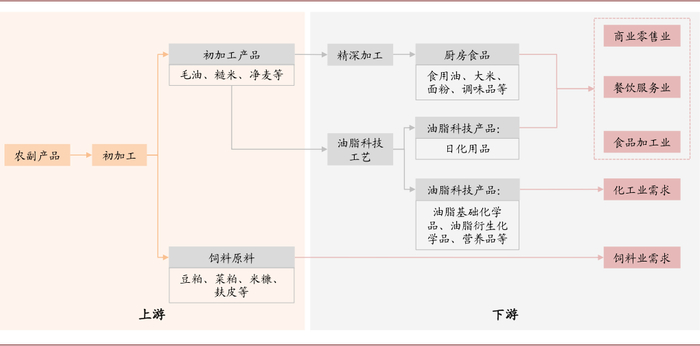 食用油产业链涵盖上、下游环节,商业模式不同:食用油产业链条较长,包括上游农副产品初加工,如油籽压榨,下游精深加工,面向零售、餐饮服务业、食品加工业等销售。我们认为产业链上、下游环节商业属性不同。企业若想从上游压榨走向下游消费品,需同时在上游环节体现出效率优势,在下游环节体现出打造品牌的能力。