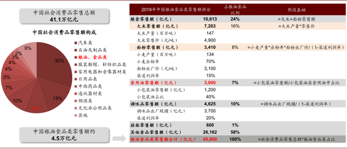 注:我们假设粮油、食品类占社会消费品零售总额的11%,则2019年国内粮油、食品类零售额约4.5万亿元