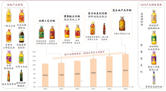 ► 迎合消费升级,细分品类推陈出新:为了满足消费者日益增加的营养保健需求,2015年以来,对于原有油种,公司对细分品类压榨工艺优化、营养配方升级,持续推陈出新,包括土榨花生油、浓香压榨菜籽油等,且2020年产品升级仍在持续。基于此,公司覆盖客户需求更加全面,销售规模扩大,且产品升级也有助盈利能力改善。