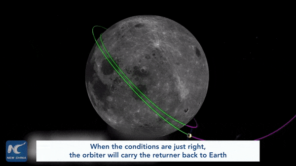 它需要飞到月球轨道上,在这里与轨返组合体交会对接,把采集到的月壤转移到返回器。