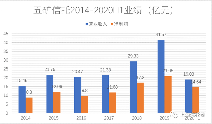 公开数据显示,2014年-2020年上半年,五矿信托的营收分别为15.46亿元、21.75亿元、20.47亿元、21.38亿元、29.33亿元、41.57亿元和19.03亿元。