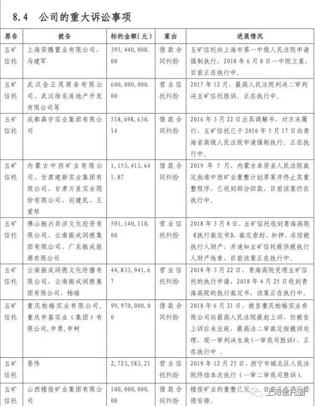 2019年报中,曾披露9笔诉讼信息,合计金额达35亿。在2019年7月,银保监会还针对房地产信托业务增速过快、增量过大的信托公司,开展了约谈警示,其中就包括五矿信托。