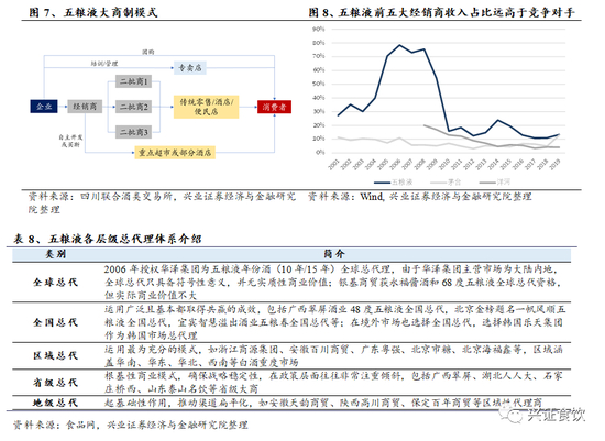 契合时代背景,实行大商制。五粮液的大商制是由经销商主导的营销模式,以省或区为单位,发展营销能力强大的经销商担任总代,由其全权代理所管辖区域的产品销售活动,拥有定价权、主导权和完善的销售网络。五粮液拥有多层次总代理,包括象征性的全球总代和全国总代、区域总代、省级总代、地级总代。在开拓国外市场时,五粮液也选择了全国总代理模式,选择乐天作为韩国总代。2005-2008年间五粮液前5大经销商的销售收入占比超过70%,而同期茅台的经销商CR5保持在10%以下。大商制的出现契合时代背景,成本低,激励性强,极大地推动了五粮液的发展。