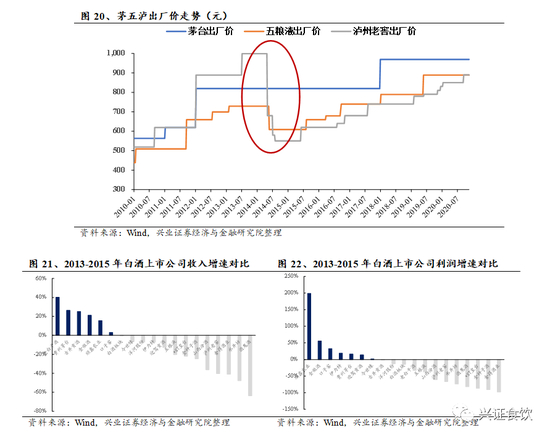 2005年五粮液利润端被茅台超越,08-12年收入端被追进,于13年彻底被超越并逐渐拉开差距,其背后是渠道策略的差异(五粮液的大商制后期乏力,不及茅台小商制对渠道的把控力度),当然也有价格策略的差异(茅台提价与五粮液大幅降价导致品牌定位拉开)。