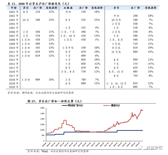 2000年后茅台10次提价,出厂价年化增速超9%,行业调整期依旧保持出厂价不变。价格是白酒品牌力最直接的体现,茅台从2000年后一共提价10次,平均单次提价幅度在20%左右。茅台在处于行业黄金十年的2006-2012年中每年均有提价,出厂价从268元大幅提升至819元,其中2008年1月初的提价一举超过五粮液,并于2009年拉开与五粮液的价差。2013年行业进入深度调整期,五粮液、老窖纷纷选择逆势提价,然而价格倒挂、渠道利润严重受损使其在2014年均大幅下调出厂价,而茅台即使在行业低迷时期依旧保持出厂价不降,此前积累的超千元渠道利润成为有效的缓冲带,帮助其顺利过冬,品牌也逐渐分层。