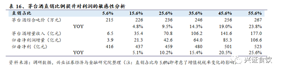直销占比提升有望带动吨酒价提升,进而贡献业绩增量。根据渠道调研数据,2019年普飞直销渠道销量占比约5.6%,假设:1)不考虑系列酒直销占比变化;2)非标茅台直销占比和普飞相同;3)茅台酒里各系列产品结构不变;4)直销占比提升不会带来额外的费用投入;5)剔除2019年增值税税率变化影响。我们根据敏感性测算发现,直销占比每提高10pct将带动吨酒价增长约4.8%,对应归母净利增量21亿/增长约5.1%。