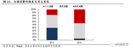 经过三年的深度洗牌后,白酒行业库存基本出清,随着货币政策放松、地产回暖、股市财富效应显现、居民收入快速增长,终端消费需求回升带动行业复苏,并伴随着消费结构的切换:由政务消费转为个人、商务消费。步入行业深度调整期起,三公禁令的实施使原本政商消费为主体的白酒需求大幅下滑,而新一轮的行业复苏是由大众消费崛起带动,从而也使白酒的消费结构发生重大变化。个人消费占比由原先的18%大幅提升至45%,政务消费则从40%降至5%,消费需求更加坚实。随着消费者主权意识觉醒,大众市场消费观念的改变、消费升级趋势将持续驱动中高端白酒市场的发展,品牌品质诉求成为趋势。