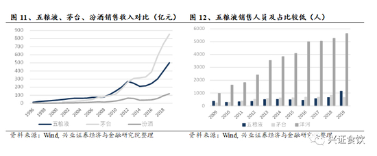 独创的渠道模式助五粮液低成本快速扩张,超越汾酒晋升第一。90年代中国白酒消费终端多元化、企业管理较为落后,五粮液的大商制、买断开发模式效率高,可借助总代的渠道资源快速抢占市场。1995年至2012年,五粮液营业收入持续增长,翻了近三十倍。对比同行来看,五粮液的销售人员很少,2019年仅1150人,占比4.4%,远低于深度分销模式的洋河(5632人/占比35.7%)。