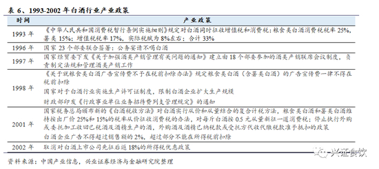 国家出台一系列白酒产业政策以限制政务消费。鲁酒在央视广告竞标上的强势表现将白酒推到风口浪尖,1996年国家23个部委联合签署“公务宴请不喝白酒”。此后相继推出白酒生产许可制度、从价和从量复合计征白酒消费税、广告宣传费不得在税前扣除、取消白酒上市公司先征后返18%的所得税优惠政策等,对中低端产品的冲击较大。