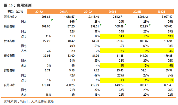 公司费用方面,整体表现较为稳定。公司比较重视产品开发及技术迭代,在研发层面一直保持稳定的投入,考虑到本次募集项目中,研发投入将占较大比例,我们预计公司研发费用率会有小幅上升;销售费用率中,运营推广费占比最大,今年公司抓住线上渠道快速增长的机遇,在京东、天猫投入的销售费用率持续加大,预计销售费用率有所提升,到了明年,考虑到线下占比有望得到回升,销售费用率将有所下降,我们预计20-22年销售费用率约为14%、13%、13%。