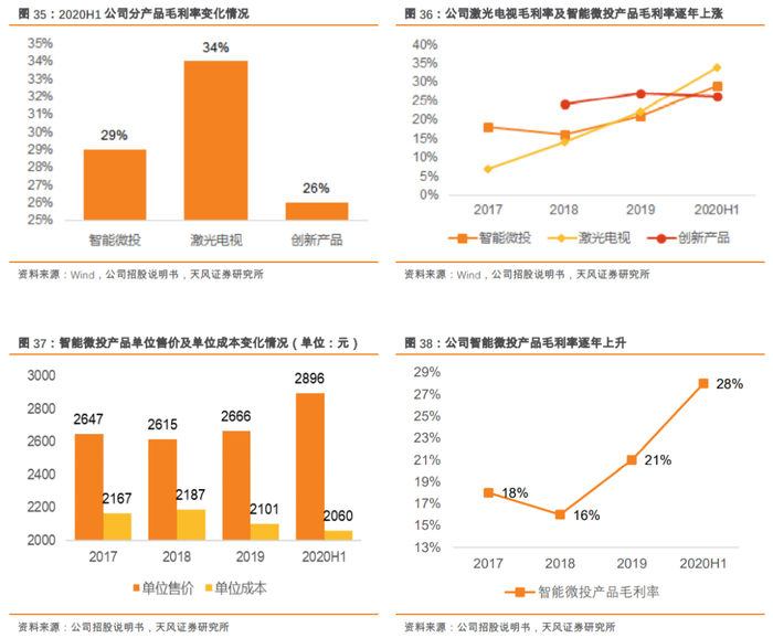 拆分来看,2020H1整机部分毛利率为29%,激光电视毛利率为34%,创新产品毛利率约为26%。智能微投方面,随着整机售价的提高、原材料价格的下降及自研光机的逐步量产,占比最大的智能微投整机产品销售毛利率得到逐步提升;激光电视产品毛利率较高,并呈逐年上升的趋势;创新产品毛利率增速较为平稳。