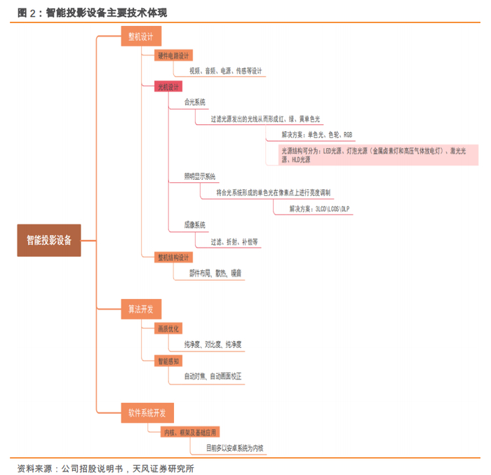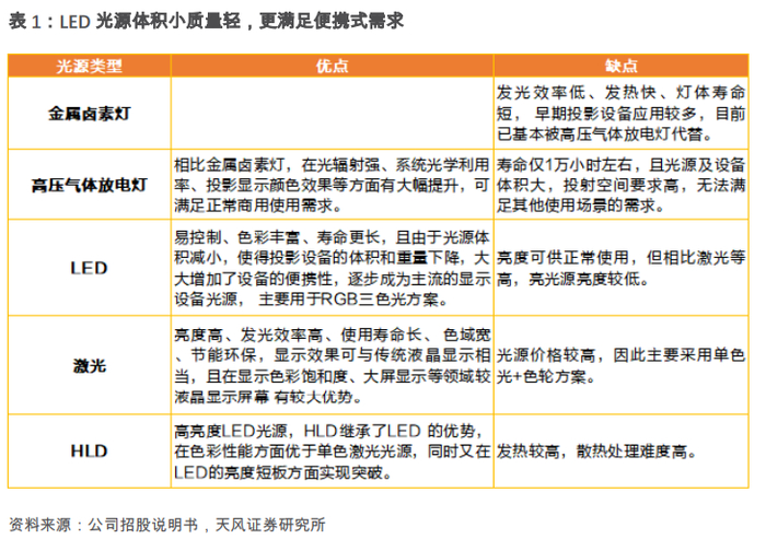 分光源结构来看,技术的更新迭代带来了的需求扩张。LED光源结构的出现,更大程度地满足便携式需求,提升了消费级市场的渗透率。目前智能微投普遍采用的是LED光源,相对于灯泡光源而言,LED光源由于光源体积减小,使得投影设备的体积和重量下降,大大增加了设备的便携性,逐步成为主流的显示设备光源, 主要用于RGB三色光方案。