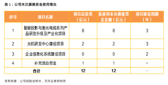 公司本次募集资金投资项目包括智能投影与激光电视系列产品研发升级及产业化项目、光机研发中心建设项目、企业信息化系统建设项目及补充流动资金。