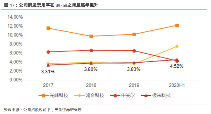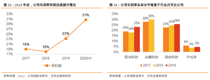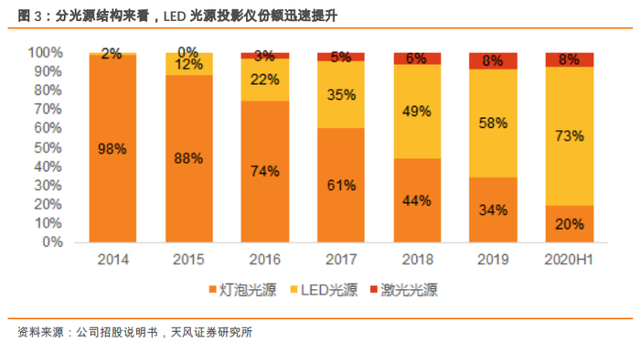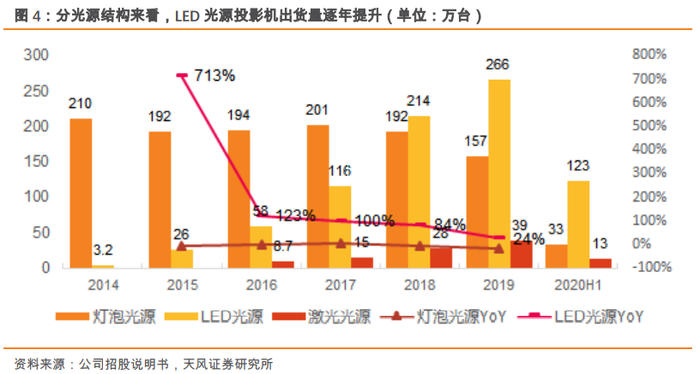 自研光机比例显著提高,2017-2018 年,公司光机均为非自研光机,到了2019年,公司实现光机技术自主化并逐步导入量产,当年度自研光机占比为 7.92%,公司自研光机占比较低。2020H1,公司自研光机占比提升至 58.72%。