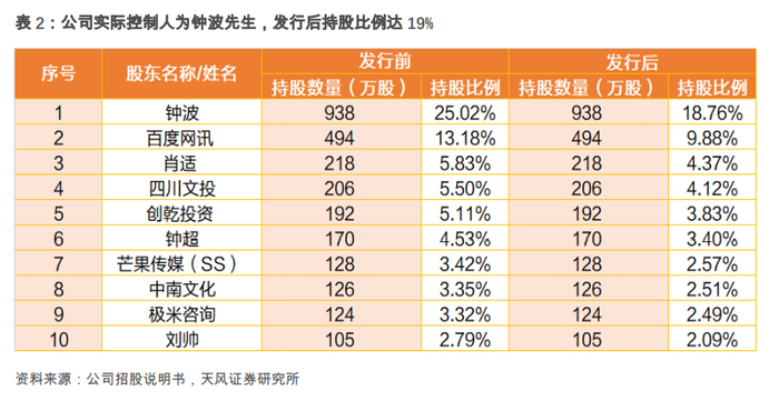 创始人钟波先生及其一致行动人合计持股比例高。公司的实际控制人为创始人钟波先生,发行后将直接持有公司19%的股份,其一致行动人肖适、钟超、刘帅等合计持有公司股份约13%,因此钟波合计控制公司股份数量达32%,此外百度网讯 、百度毕威也为公司重要股东,合计持股比例为11.6%。