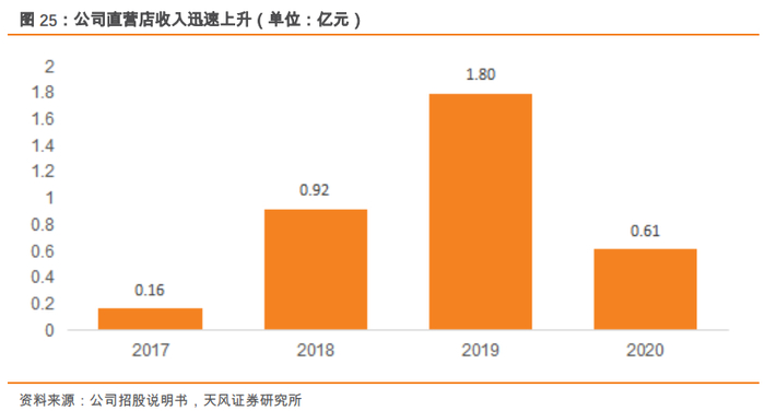 2017-2020H1,公司线下直营店铺数量分别为15家、75家、55家和48家。公司线下直营店铺有所减少,主要由于公司关闭了部分销售额较低的直营店铺,伴随着优质直营店铺数量的增加和单店收入的提升,公司线下收入实现了较大幅度的增长。