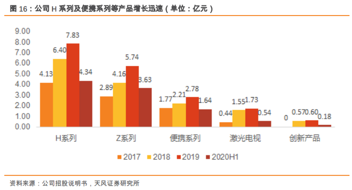 从产品价格来看,2017-2019 年,公司智能微投产品系列的H系列、Z系列和便携系列平均价格整体相对稳定。2019 年度智能微投系列其他产品平均价格有所提高,主要系 2019 年度公司发布 4K 级高性能产品RS Pro,该产品售价较高导致其他产品整体平均价格上升。2020H1智能微投各系列平均单价均明显提升,主要系公司 2019 年推出的多款新产品销售价格较高且销售占比提升。