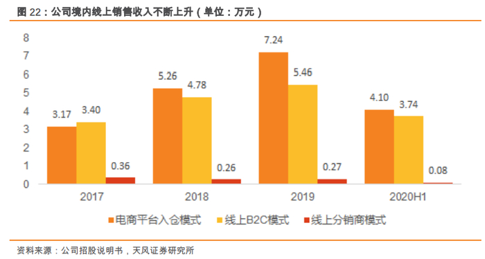 线上渠道是公司主要的销售渠道,线上收入主要来自于电商平台入仓模式、线上B2C模式及线上分销商模式。电商平台入仓销售模式下,公司与电商平台签署销售合同并委托第三方物流公司将商品运送至电商平台指定的仓库,由电商平台负责商品的销售、物流配送及收款工作, 电商平台为公司的客户。线上B2C销售模式下,公司与线上销售平台签署代售合作协议,公司在电商平台上开设店铺从而直接面向终端消费者销售,店铺运营、商品管理、物流、客服等活动由公司负责,线上销售平台收取平台服务费。