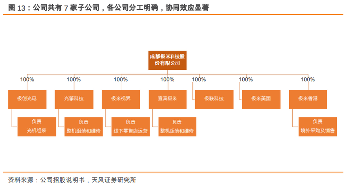 公司共拥有7家子公司,各公司分工明确,协同效应显著。子公司极创光电主营光机组装业务,为公司主要产品投影仪的核心元器件,2020H1净利润约102万元;极米视界主要负责线下零售店的运营,承担了极米科技主要产品的销售,2020H1净利润为534万元;极米香港主营核心元器件的境外采购及产品的境外销售,2020H1净利润为1485万元。