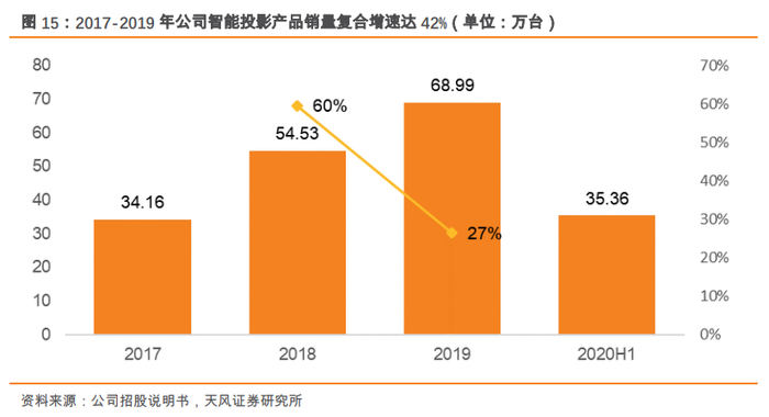 1)出货量稳居第一,销量增速仍居高位。公司已经发展成为国内智能投影设备行业的龙头企业,2018年至今公司出货量保持位居中国投影设备市场第一。