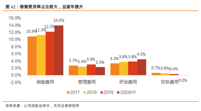 公司是典型的2C品牌,商业模式的不同使得公司销售费用率处于行业内较高水平。公司销售费用率中,营运推广费占比最大。2017-2020H1,营运推广费、职工薪酬、房租物业及装修费、平台服务费和运杂费五项费用占销售费用的比例均在88%以上。营运推广费主要包括支付给京东、天猫等平台的广告宣传费、天猫团队运营费、送给客户的赠品以及新品发布展会、国外CES 等参展费等。公司成立时间相对较晚,成立以来需不断地树立品牌形象,进行市场推广,未来随着公司业务规模扩大,口碑积累及品牌知名度逐步上升,营运推广费用投入相对收入拉动的转化率有望得到进一步提升。