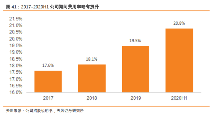 随着公司营收规模的不断扩大,期间费用率总体略有增长。2017-2020H1公司期间费用率分别为17.6%、18.1%、19.5%和20.8%,其中销售费用率占比最大,分别为10.92%、11.29%、12.24%和 14.01%,呈上升趋势,主要原因是随着公司销售规模的扩大,营运推广费、平台服务费和运杂费均有所上涨,同时,公司于全国主要城市重点商圈自主开设并运营门店,随着直营店铺的数量增加, 职工薪酬和房租有所提升。