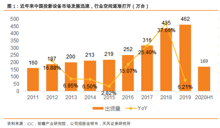 中国投影设备市场进入高速发展阶段,行业空间逐渐打开,我们认为这主要得益于消费级场景渗透、全新光源应用及线上渠道放量三大驱动因素。根据IDC数据,2011年至2019年度中国投影设备出货量年均复合增速达14.19%,15年之后销量增速提升趋势显著,除线上渠道快速增长之外,LED光源放量提升成为投影设备市场迅速发展的主要推动力。2015年至2018年中国投影设备出货量年均复合增速高达25.70%。
