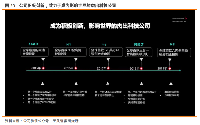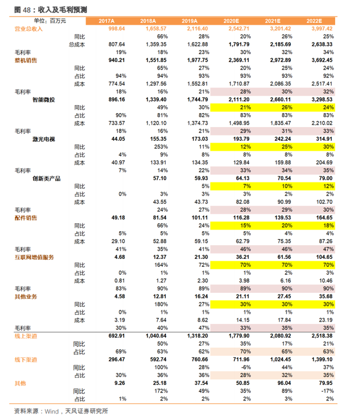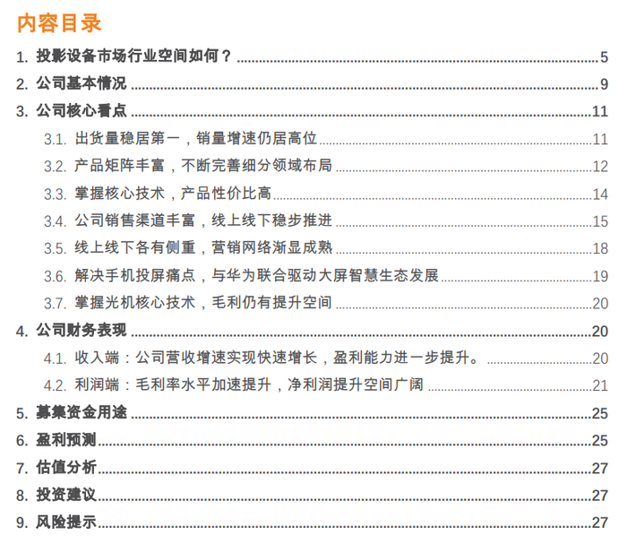 随着光源等投影相关技术的进一步成熟及人工智能新型领域在投影行业的逐步应用,中国投影设备市场进入高速发展阶段,行业空间逐渐打开。公司作为国内智能微投行业的龙头企业,出货量稳居第一,销量增速仍居高位;产品矩阵不断丰富,便携及Movin 系列的推出使得价格带进一步延伸的同时逐步完善细分领域的布局;已建立完善的销售渠道,线上线下各有侧重,营销网络逐步成熟;与此同时,公司掌握核心技术,自研光机占比的逐步提升,成本端得到显著下降。我们预计公司20-22年收入规模25.4、32.0、40.0亿元,增速为20%、26%、25%,净利润为1.8、2.8、4.1亿元,增速为90%、56%、49%。