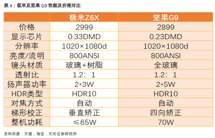 对比电视机、手机及平板电脑,投影仪在应用场景和目标客群方面有显著差异,产品形态及未来技术发展各有侧重,是竞合关系,既可以是产品补充,也可以是部分替代。随着智能手机的普及,大家对于影音的需求在分化。若只追求内容式更新,不对影音效果做更高的要求,那么手机、平板及一般的电视机可以解决;但还有一部分消费者追求极致的视听体验,此时投影类或是大屏液晶类产品才能与之相匹配。除此之外,智能微投尺寸普遍更小、重量更轻,适应于多区域的场景切换,比如客厅、卧室、书房等不同场景间的区域移动,解决用户便携性的需求痛点。而对于激光电视,我们认为激光电视是投影类的高端化产品,旨在追求极致的大屏体验,对于画面质感要求高的消费者愿意支付更高的溢价。