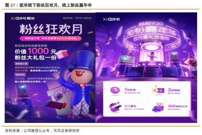 公司线上销售渠道侧重引流及促销,除电商平台活动外,公司还积极推动品牌日、 极米粉丝节等活动,提高品牌热度并实现产品销售。线下销售渠道侧重消费者教育及产品宣传,通过实际的使用体验吸引并转化潜在消费者。凭借线上及线下多层次的营销网络,公司可充分触达潜在目标消费群体,为行业未来可能的发展变革做好充分准备。