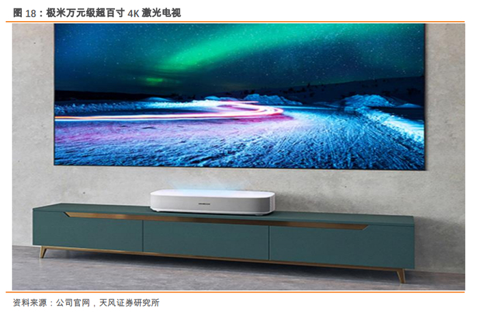 激光电视方面,产品采用激光光源,是具备超短距离投射能力的智能投影设备,主要用于客厅等家用场景。目前市场上液晶电视尺寸受液晶面板的尺寸限制难以实现低成本大屏显示,而激光电视可轻松达到百寸以上投射面积,符合未来低成本和高画质的大屏化发展趋势。