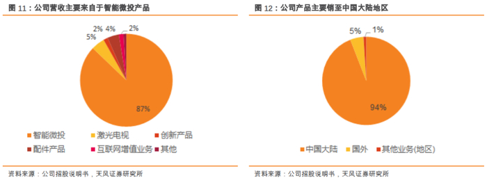 公司主营业务收入主要来自于智能微投、激光电视和创新产品整机产品,合计约占2020H1主营业务收入的94%,其中智能微投产品占比最大,约达87%。产品绝大部分销往中国大陆,海外业务收入逐年提升,2020H1外销占比约达5%。极米正在全力开拓海外市场,目前在日本家用投影市场已经取得了第一。