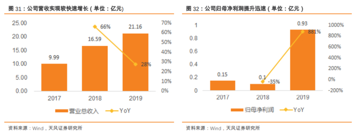 2017-2019年公司分别实现营业收入10、17、21亿元,近两年同比分别+66%和+27.60%,年复合增速达46%;归母净利0.15、0.1、0.93亿元,近两年同比分别-35%和+881.43%,年复合增速达152%;公司2020H1实现营收11.44亿元,归母净利0.97亿元。