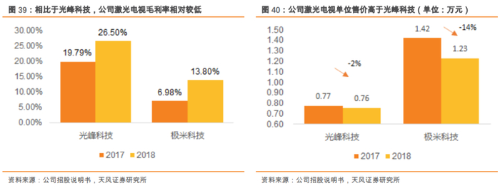 在毛利率方面,公司激光电视产品的毛利率水平低于光峰科技的激光电视产品,主要因为公司激光电视核心零部件光机占成本比重50%以上,而光峰科技的光机产品大多为自行开发生产,因此毛利率较高。