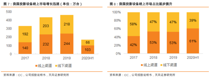 分渠道来看,线上渠道的成熟发展为其提供了契机。随着智能投影设备市场的增长,投影设备市场终端消费者结构亦逐渐由 B 端客户为主转变为C端客户为主,在国内电子商务市场的成熟发展下,线上渠道凭借广泛的消费者触达能力和便捷的购物体验,迅速成为投影设备厂商的主要销售渠道。